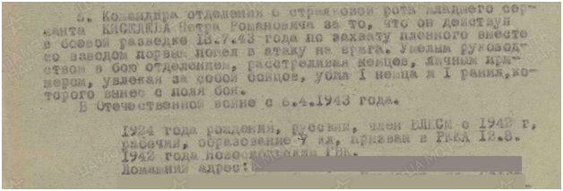 20 июля 1943 г. П.Р. Киселев был награжден медалью «За отвагу». Из приказа о награждении: «Командира отделения 6 стрелковой роты младшего сержанта Киселева Петра Романовича за то, что он, действуя в боевой разведке 13.7.43 года по захвату пленного, вместе со взводом первым пошел в атаку на врага. Умелым руководством в бою отделением, расстреливая немцев, личным примером увлекая за собой бойцов, убил 1 немца и 1 ранил, которого вынес с поля боя».