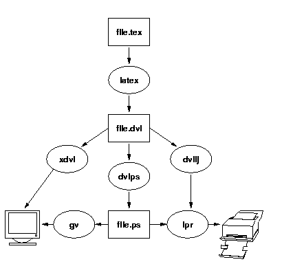 Документы набираются в виде обычных ASCII-файлов, содержащих как текст, так и специальные команды, определяющие разметку документа, служащие для вставки символов, отсутствующих в ASCII и т.д. Эти файлы (они обычно имеют расширение ".tex") транслируются специальной программой в т.н. файлы ".dvi" (DeVice Independent -- независимые от устройства вывода), которые могут потом отображаться на экране или выдаваться на печать.