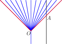 Почему эту величину естественно назвать углом? Рассмотрим трёх инерциальных наблюдателей, движущихся в одной плоскости. Пусть их мировые линии пересекаются в одной точке (O, рис. 7). Тогда